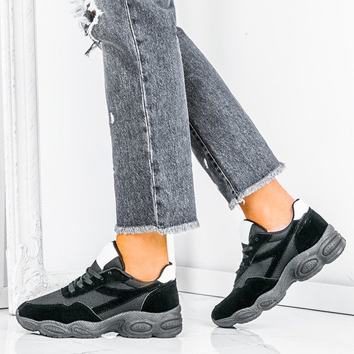 - Obuwie sportowe wykonane z połączenia ekologicznego zamszu oraz tkaniny w kolorze czarnym. Cholewka jest sznurowana. Wkładka tkaninowa. Solidnie wykonane i bardzo wygodne dzięki grubiej podeszwie.