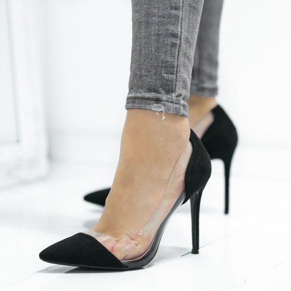 • Wyraziste czółenka na szpilce ze skóry ekologicznej zamszowej w kolorze czarnym. Po bokach przezroczysta wstawka z tworzywa sztucznego. Nosek wykończony w szpic. Idealne do każdej stylizacji!