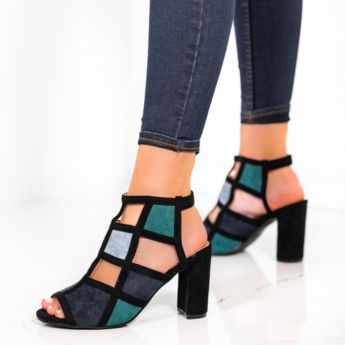- Sandały na słupku z wycięciami wykonane ze skóry ekologicznej zamszowej. Model w kolorze czarno - niebiesko - zielonym. Buty bez zapięcia. Wkładka ze skóry ekologicznej. Świetnie prezentują się na stopie!