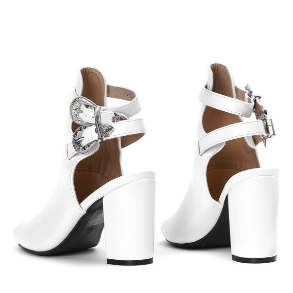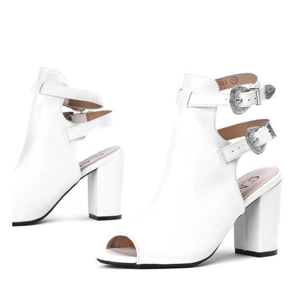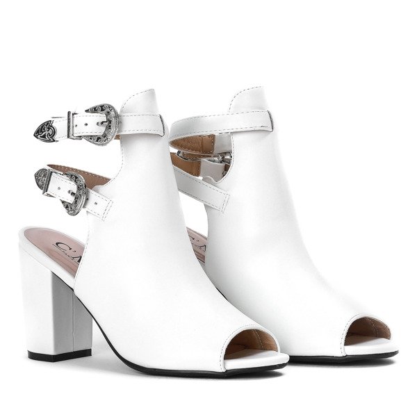 - Botki na słupku z odkrytą piętą i noskiem w kolorze białym. Cholewka wykonana z ekologicznej skóry. Model zapinany na dwie sprzączki.