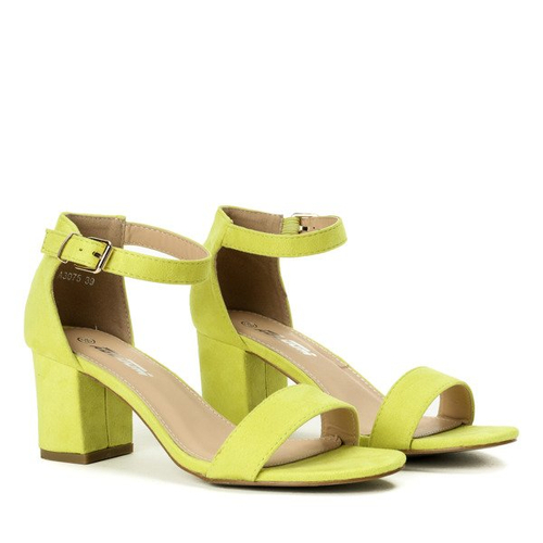 - Bardzo eleganckie sandały na niskim słupku w kolorze neonowo - żółtym. Buty ze skóry ekologicznej zamszowej. Model zapinany sprzączką na kostce. Idealne do sukienek!