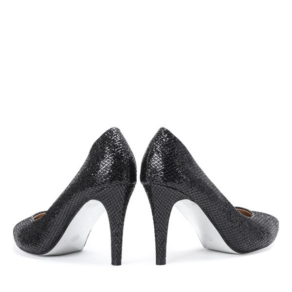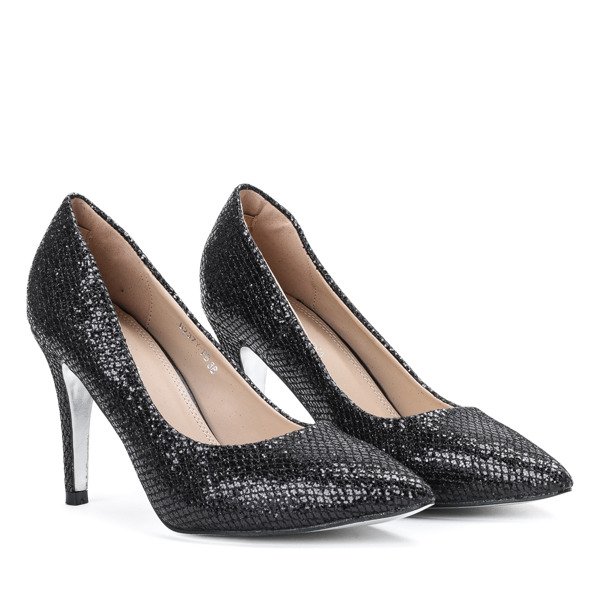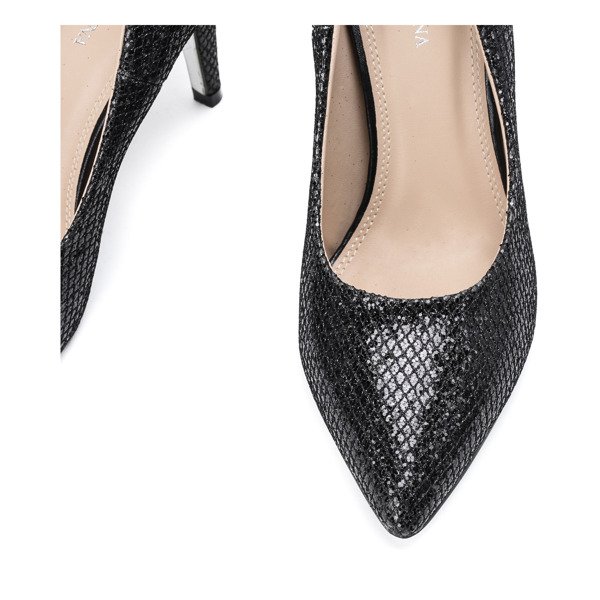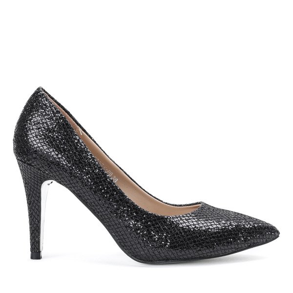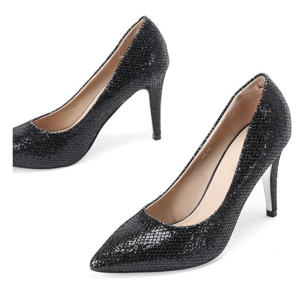 - Eleganckie buty typu szpilki w kolorze czarnym. Materiał wykonany ze skóry ekologicznej, który pokryty jest brokatem. Nosek zakończy w szpic, który optycznie wyszczupla nogi. Idealnie się sprawdzą na wieczorne wyjścia!