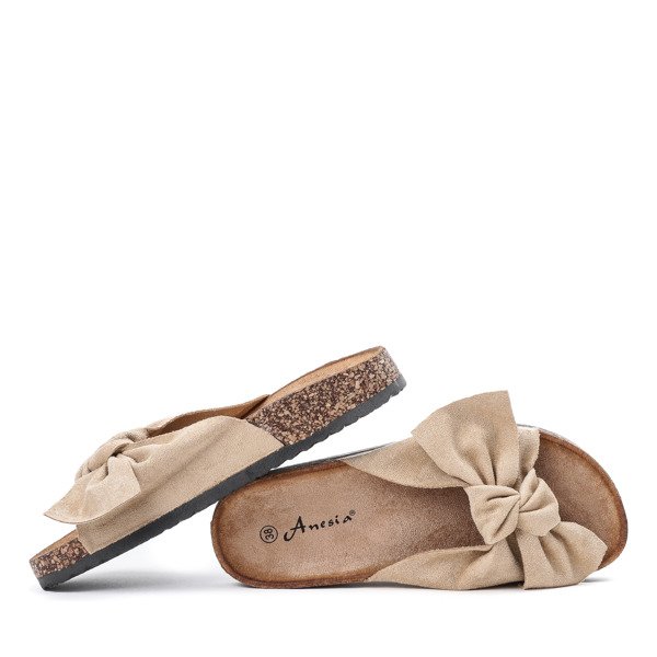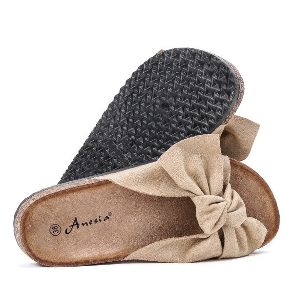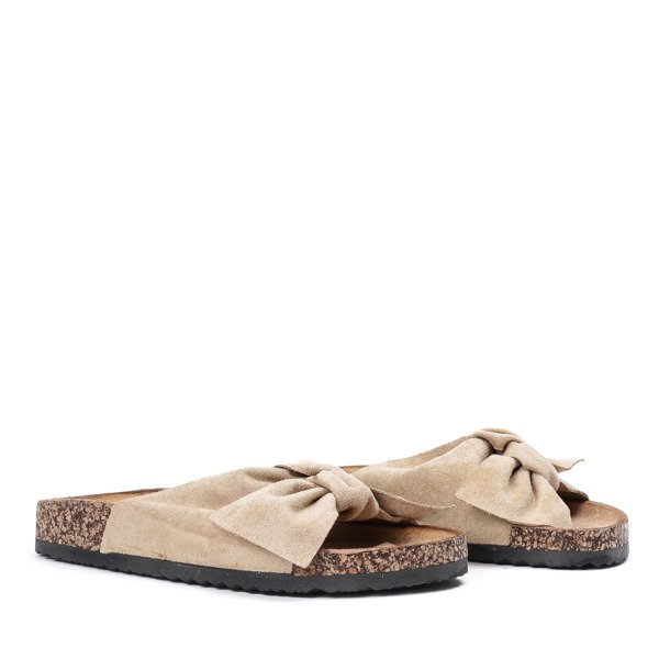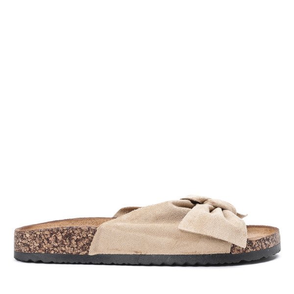 - Bardzo wygodne klapki wykonane z ekozamszu w kolorze beżowym. Pasek ozdobiony efektowną kokardką. Idealne na długie spacery. Obuwie damskie, które świetnie wkomponuje się w Twoją stylizację na cieplejsze dni!