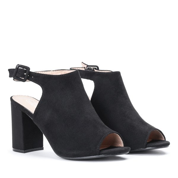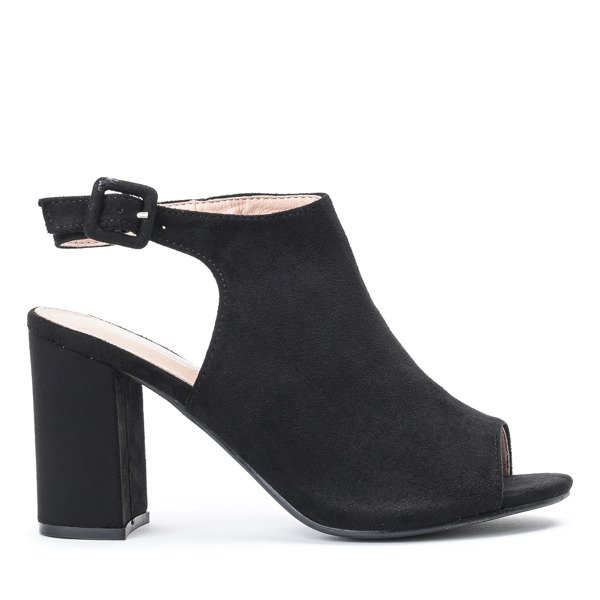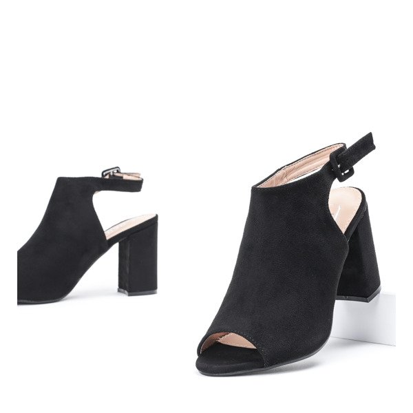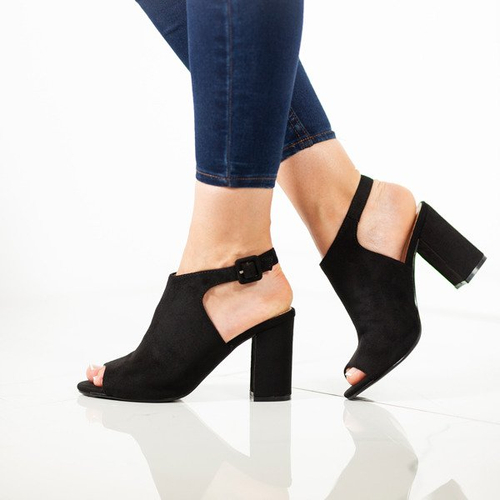 • Wyjątkowe sandały z cholewką w kolorze czarnym na wysokim, stabilnym słupku. Materiał wykonany z ekologicznego zamszu, zaś wkładka ze skóry ekologicznej. Zapinane sprzączką po zewnętrznej stronie. Rewelacyjne obuwie damskie - idealne na cieplejsze dni!
