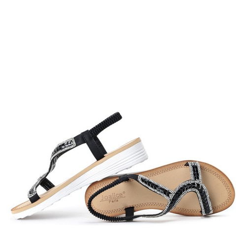 - Klasyczne sandałki damskie wykonane ze skóry ekologicznej w kolorze czarnym. Paseczki zdobione kamyczkami oaz cyrkoniami. W tylnej części elastyczna guma przytrzymująca stopę. Ten model będzie idealnym dodatkiem do krótkich spodenek.