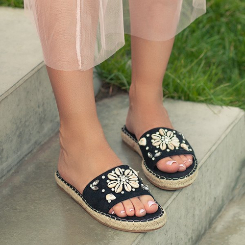 - Rewelacyjne klapki w kolorze czarnym, wykonane z ekologicznego zamszu. Paseczek zdobiony cyrkoniami oraz muszelkami. Podeszwa wykończona plecionym sznurkiem jutowym. Niesamowicie wygodne obuwie damskie, które idealnie dopełni letnie stylizacje!