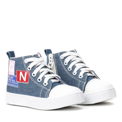 - Dziewczęce trampki w kolorze niebieskim, wykonane z tkaniny a'la jeans. Model sznurowany oraz zapinany ozdobnym suwakiem po boku. Cholewka butów zdobiona printem z napisami. Buty idealne dla dziewczynek.