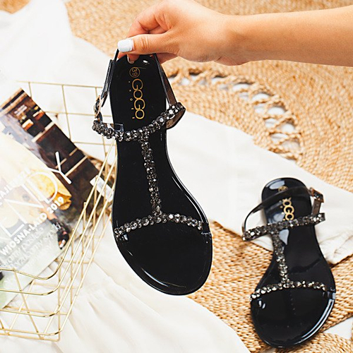 - Urocze czarne sandały na płaskim obcasie wykonane z gumowego materiału. Model zapinany na sprzączkę po zewnętrznej stronie. Prezentowane obuwie damskie posiada ozdoby w formie cyrkonii.