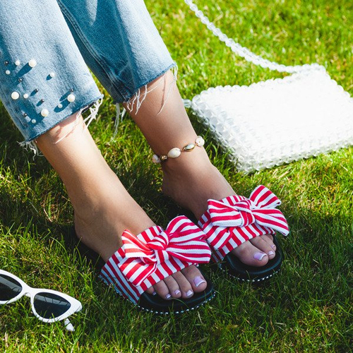 • Damskie klapki wykonane z materiału tkaninowego w biało-czerwone paseczki. Cholewka posiada kokardkę. Czarna gumowa podeszwa zdobiona srebrnymi dżetami. Lekki, wygodny model okaże się idealnym obuwiem na co dzień.