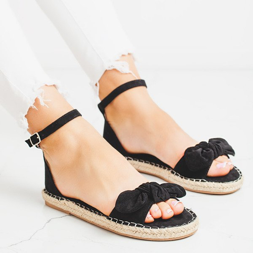 - Wyjątkowe sandały damskie na płaskiej podeszwie w kolorze czarnym. Materiał pokryty miękkim ekologicznym zamszem. Na paseczku ozdobna kokardka. Podeszwa wykończona plecionym sznurkiem jutowym. Wokół kostki cienki paseczek zapinany na sprzączkę.