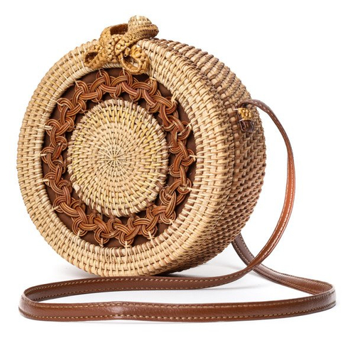 - Mini okrągła torebka typu kuferek wykonana z wikliny w kolorze brązowym. Posiadają zamknięcie na drewniany guzik. Wnętrze pokryte tkaniną.