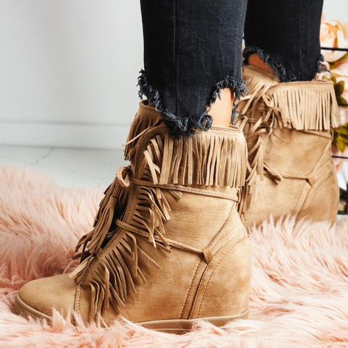 • Brązowe sneakersy na krytym koturnie wykonane ze skóry ekologicznej zamszowej. Cholewka sznurowana oraz zdobiona frędzelkami. Model posada gumową podeszwę.W środku ocieplenie w formie futerka.To obuwie damskie będzie idealnie pasować do jeansów.