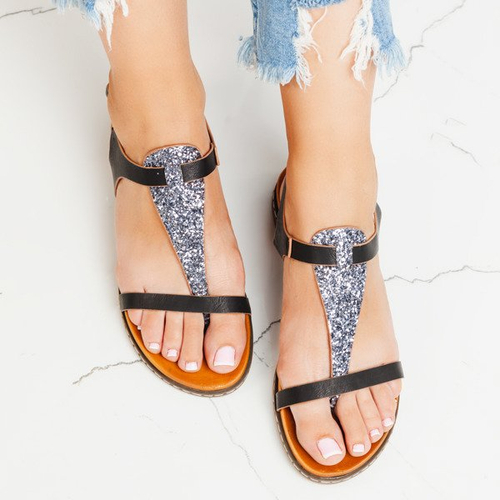 • Sandałki a'la japonki na płaskim gumowym obcasie wykonane ze skóry ekologicznej w kolorze czarnym. Model zapinany sprzączką po boku. Przednia część zdobiona ozdobnym brokatem. Obuwie damskie będzie idealnym dodatkiem do klasycznych stylizacji.