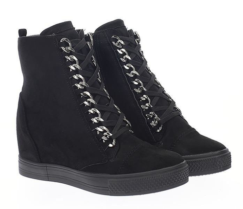 - Klasyczne sneakersy wykonane z zamszu. Obuwie ozdobione łańcuszkiem przez który przeplecione są sznurówki. Dla ułatwienia zakładania z boku suwak. Idealne dla Pań w dobrym stylu!
