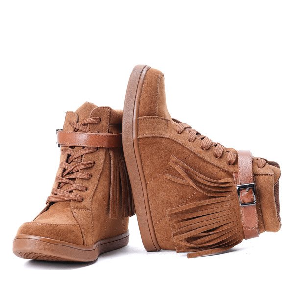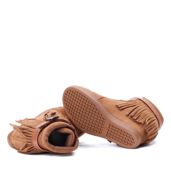 - Jedyne w swoim rodzaju botki wykonane z miękkiego zamszu. Ich główna ozdobą są frędzle w stylu boho i klamerka. Mimo casualowego kroju, sylwetka prezentuje się w nich znakomicie, dzięki koturnie. Solidnie wykonane i bardzo wygodne.