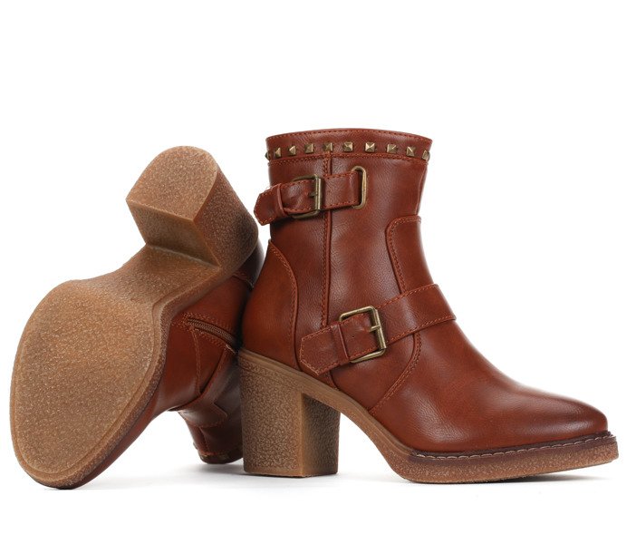 • Botki na słupku, wykonane ze skóry ekologicznej. Na cholewce znajdują się srebrne ćwieki. Buty zapinane zamkiem z boku, posiadają dwie ozdobne klamry. Doskonale prezentują się z jesiennym płaszczem oraz jeansami.