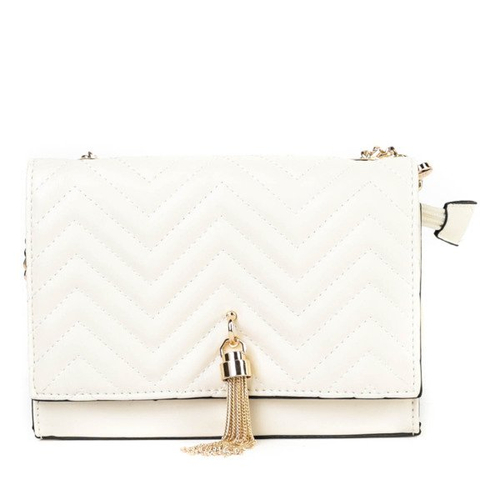 - Mała torebka na złotym łańcuszku w kolorze beżowym. Materiał wykonany ze skóry ekologicznej z pikowanym wykończeniem. W środku posiada 1 kieszonkę. Model zdobiony złotym frędzelkiem.
