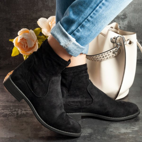 - Niezwykle czarne botki na płaskim obcasie. Cholewka wykonana ze skóry eko-zamszowej. Model wsuwany - nie posiada zapięcia. Obuwie nieocieplane, w środku posiada tkaninową wkładkę. Klasyczny krój sprawdzi się do wielu modnych stylizacji.