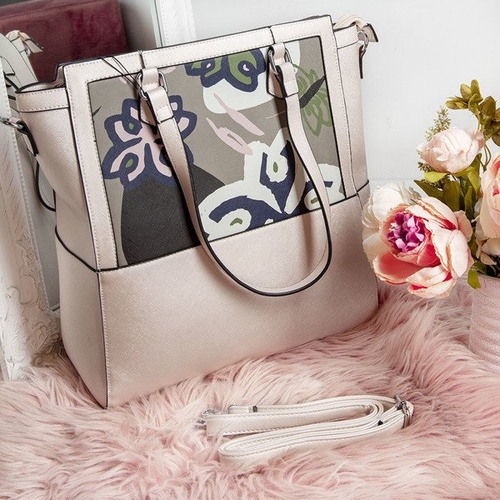 - Geantă mare de culoare aurie din piele ecologică. Motiv floral decorativ pe față. Un buzunar mic cu fermoar în spate. 1 compartiment mare și unul mai mic în interior. Anexă
