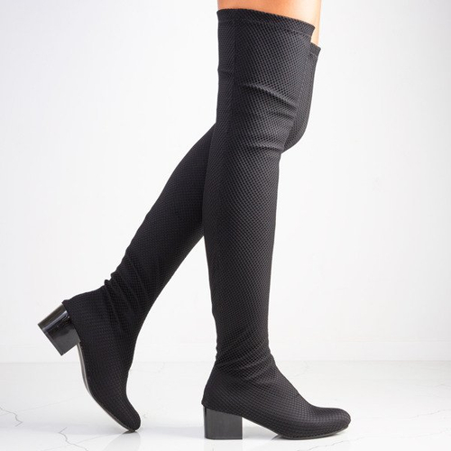 - Długie kozaki na słupku sięgające za kolano. Cholewka wykonana z tkaniny oraz siateczki w kolorze czarnym. Model nie posiada zapięcia jak i ocieplenia.