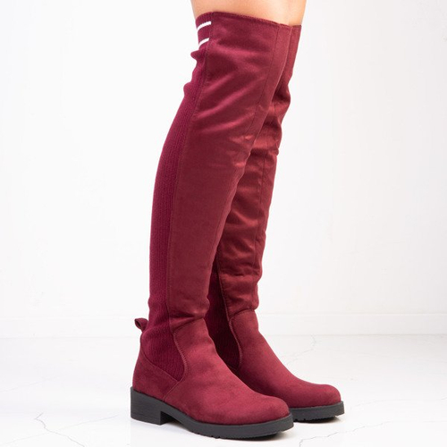 - Wysokie bordowe kozaki na płaskim obcasie wykonane ze skóry ekologicznej zamszowej. Cholewka posiada wstawki z rozciągliwej tkaniny. W środku nie posiadają ocieplenia. Idealnie się sprawdzą na jesiennie dni!