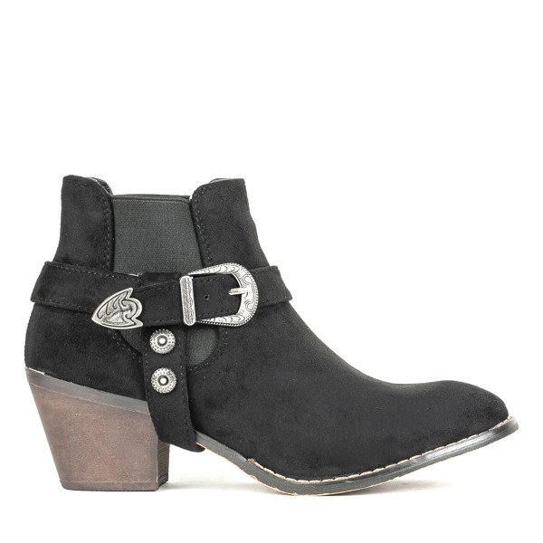 • Cizme negre a'la cizme cowboy pe o coloană joasă din piele ecologică de piele de căprioară. Model slip-on - nu are fixare. Cataramă decorativă pe lateral. Pantofii de damă nu au izolație suplimentară. NOTĂ: tocurile pot avea o nuanță ușor diferită.