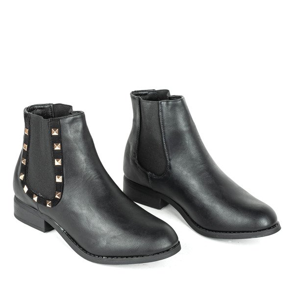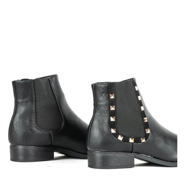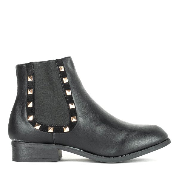 - Botki na płaskim obcasie wykonane z czarnej eko-skóry. Na cholewce wstawki z elastycznego materiału ułatwiające zakładanie buta. Obuwie damskie posiada ozdobę w formie złotych ćwieków.
