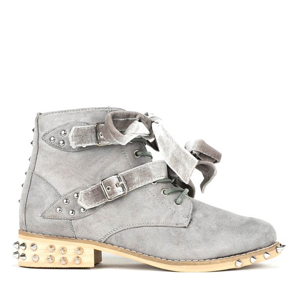 - Workery na płaskim obcasie w szarym kolorze. Zapinane na suwak oraz sznurowane. Cholewka wykonana z materiału eko zamszowego. Dodatek w formie ćwieków i kokard czyni je unikatem wśród butów. Solidnie wykonane. Pasują do wielu stylizacji.