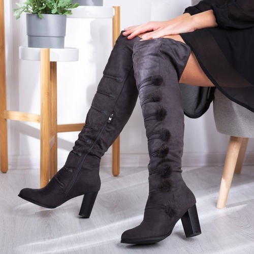 - Urocze kozaki na wysokim słupku z cholewką nad kolano. Materiał wykonania to szary eko-zamsz. Środek delikatnie ocieplony futerkiem. Obuwie damskie jest zapinane na zamek. Kozaki posiadają ozdoby w formie kuleczek z futra. Idealne na chłodne dni!
