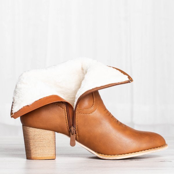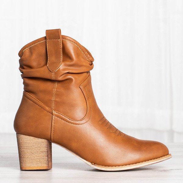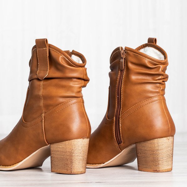 - Niesamowicie wygodne damskie botki typu kowbojki na drewnianym słupku. Cholewka wykonana ze skóry ekologicznej w kolorze brązowym. W środku posiadają ocieplenie w formie futerka. Z boku zapinane są na suwak. Doskonale się sprawdzą chłodniejsze dni!