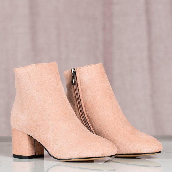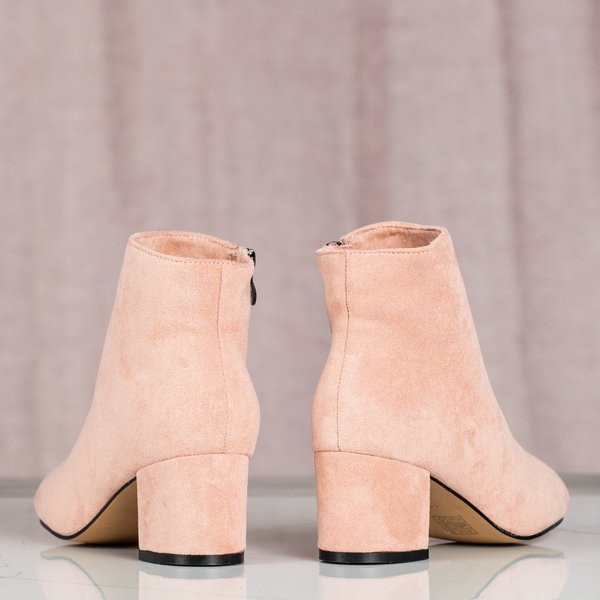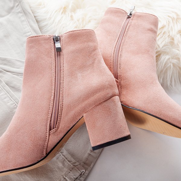 • Eleganckie botki na słupku z okrągłym noskiem. Materiał wykonania cholewki to eko-zamsz w różowym kolorze. Wkładka jest pokryta eko-skórą. Zapięcie na suwak po wewnętrznej stronie. Prezentowane obuwie damskie pasuje do wielu kreacji!