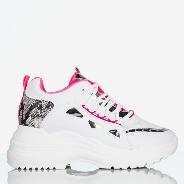 - Încălțăminte sport la modă pentru femei, cu talpă groasă. Partea superioară este confecționată din piele ecologică în alb. În plus, are inserții decorative cu un finisaj metalic și cu relief în piele de a'la de șarpe pentru animale. La mijloc au o pană ac