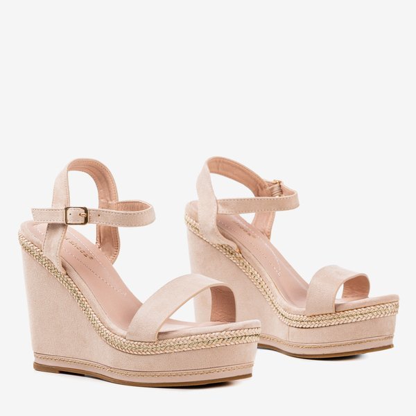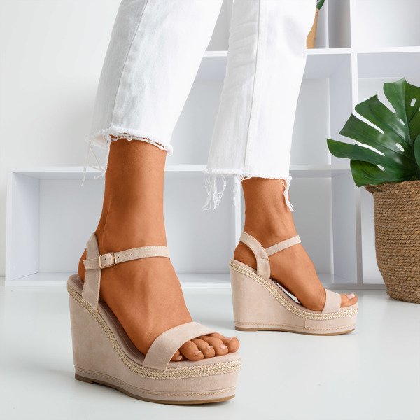 - Sandały na koturnie wykonane ze skóry ekologicznej zamszowej w kolorze beżowym. Buty zapinane sprzączką na wysokości kostki. Podeszwa zdobiona paseczkiem ze sznurka jutowego.
