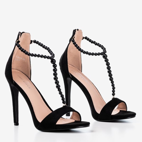 - Eleganckie sandałki damskie na szpilce w najprostszym wydaniu. Cholewka wykonana z zamszu ekologicznego, zaś wkładka pokryta skórą ekologiczną. Model zdobiony ozdobnymi koralikami. Z tyłu posiadają zapięcie w formie suwaka.