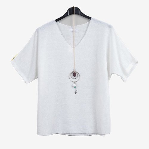 - Damska bluzka z krótkim rękawem wykonana z materiału tkaninowego. Na dekolcie wykończenie srebrną nicią. Świetna odzież na co dzień. Do bluzki dołączono naszyjnik z zawieszkami. UWAGA: Dokładność pomiaru (+/-) 1 cm.