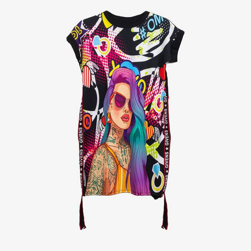 - Stylowa wielokolorowa sukienka z krótkim rękawem. Wykonana z tkaniny bawełnianej. Z przodu sukienka posiada nadruk w komiksowym stylu. Zakładana przez głowę. UWAGA: Dokładność pomiaru (+/-) 1 cm.