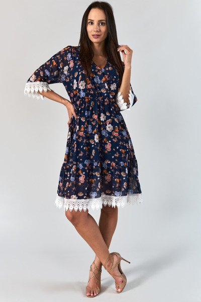 - Letnia sukienka zdobiona kwiatkami, wykonana z tkaninowego materiału. Model o długości midi z dekoltem w serek. W talii szeroka, rozciągliwa gumka - pod spodem podszewka. Rękawy oraz dolna część zdobione koronką. UWAGA: Dokładność pomiaru (+/-) 1 cm.