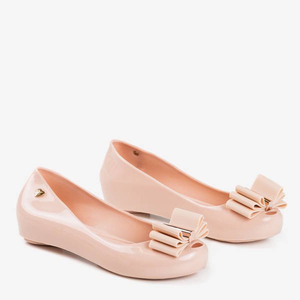 - Baleriny typu meliski w kolorze beżowym na krytym koturnie. Obuwie jest wykonane z tworzywa gumowego. Nosek zdobiony kokardą. Świetny dodatek do codziennych stylizacji!