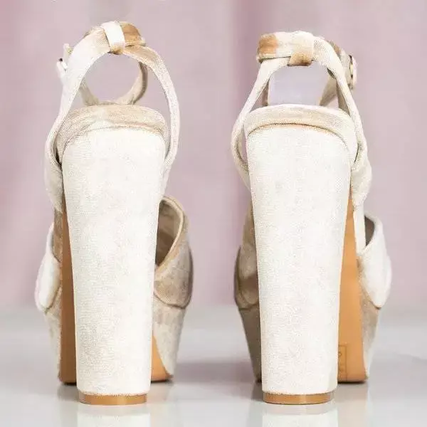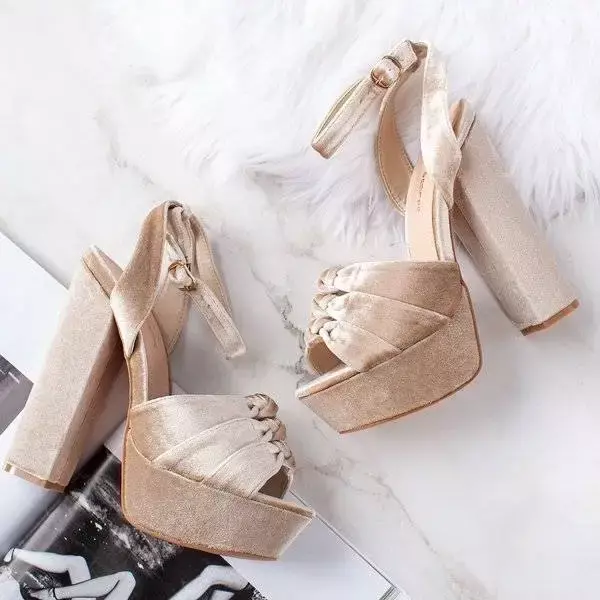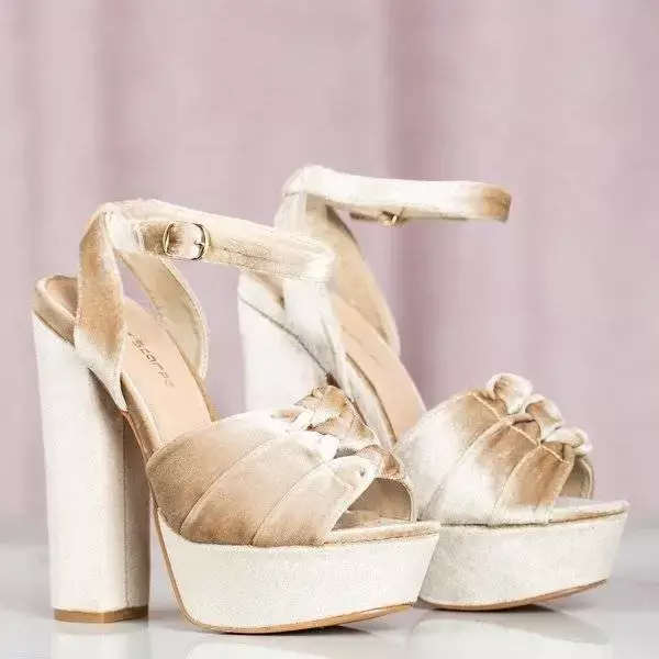 - Sandale bej cu toc înalt din material velur. Model de culoare Burgundia. Pantofii pentru femei sunt fixați cu o cataramă pe gleznă. Pantofi perfecti pentru zilele mai calde. Notă: produsul are urme de adeziv pe material.
