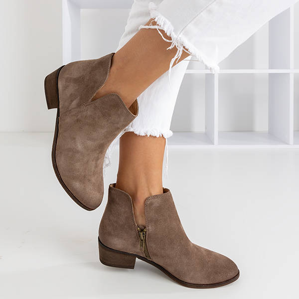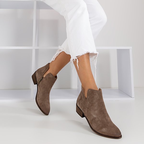 • Klasyczne damskie botki na płaskim obcasie. Materiał wykonania to naturalna skóra zamszowa, w środku eko-skórzana wkładka. Cholewka zapinana suwakiem po boku i posiada wycięcia. Będą świetną ozdobą do codziennych stylizacji.