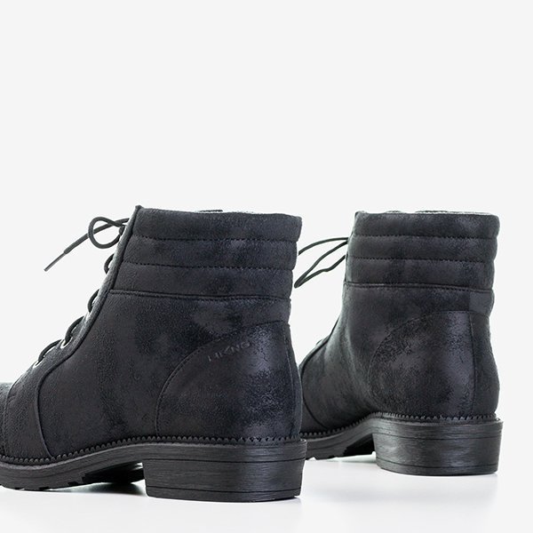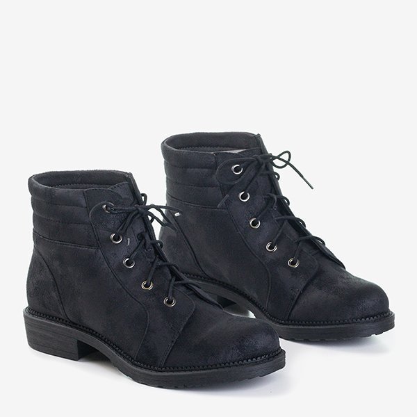 - Cizme pentru femei cu toc plat din piele ecologică de antilopă cu abraziuni decorative. Muncitori de culoare neagră, legați cu șireturi. Adăugarea perfectă la ținuta ta de toamnă / iarnă.