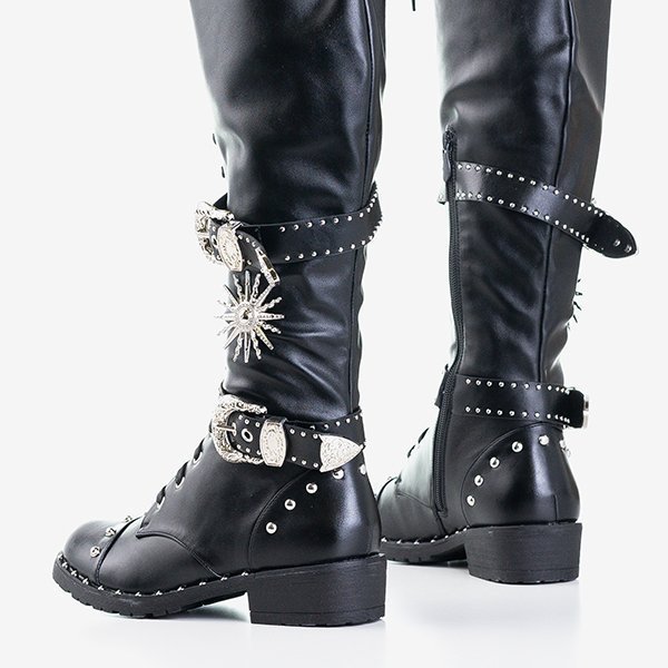 - Ghete uimitoare cu toc plat din piele ecologică de culoare neagră. Partea superioară este decorată cu catarame și zete argintii. Interior căptușit cu blană. Model cu șiret și fermoar la gambe mijlocii.