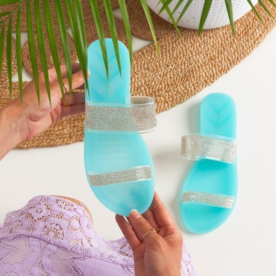 - Wyjątkowo lekkie damskie klapki na lato wykonane z tworzywa gumowego. Przezroczyste paseczki zdobione cyrkoniami. Nadają się do wielu codziennych stylizacji. Uwaga: w produkcie brakuje kilku ozdób.