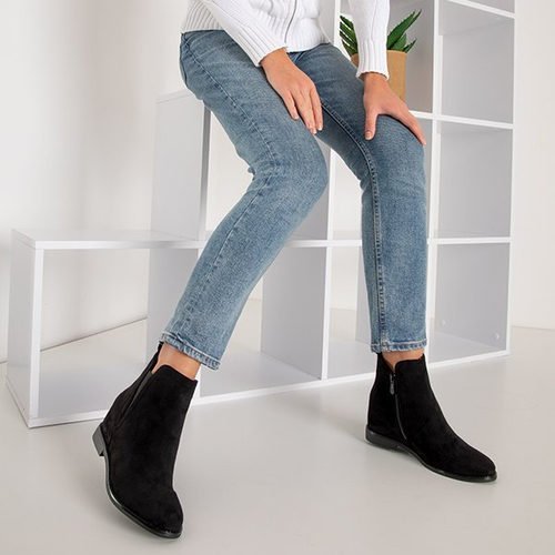 • Cizme negre cu vârf rotund, din piele ecologică de piele de căprioară. Interiorul pantofului este căptușit cu țesătură, nu izolat. Încălțăminte pe toc înclinat, acoperit. Modelul este fixat cu fermoar lateral. Perfect pentru zilele de toamnă!