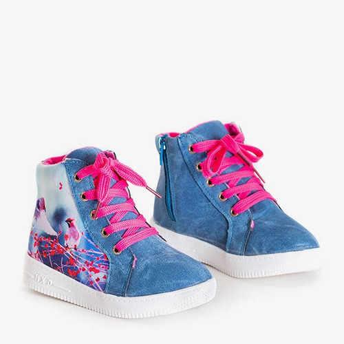 • Adidași pentru copii din blugi a'la din culoarea albastră. Partea superioară are o imprimare decorativă la exterior. Model cu șiret și fermoar lateral. NOTĂ: produsul poate avea urme de adeziv pe material.