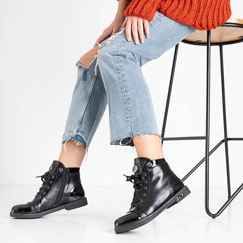 - Ghete de dama negre din piele ecologica. Partea superioară are inserții lăcuite. Model cu șiret și fermoar lateral. Interiorul pantofului este căptușit cu țesătură. Vor fi o potrivire perfectă pentru stilizările de toamnă.