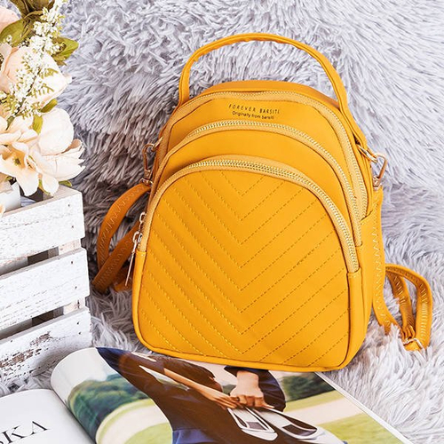 - O geantă de mână pentru femei care imită un rucsac, din piele ecologică cu finisaj parțial matlasat. Modelul are 3 compartimente fixate cu fermoar.
