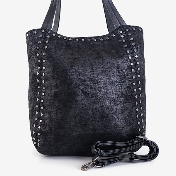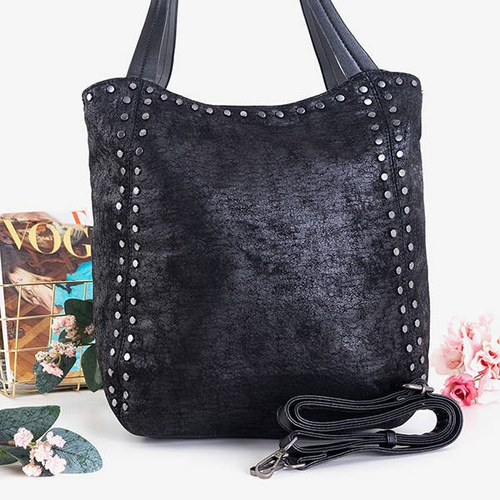 - Geantă mare de umăr pentru femei, realizată din piele ecologică de culoare neagră. Materialul este decorat cu strasuri. Model cu fermoar.