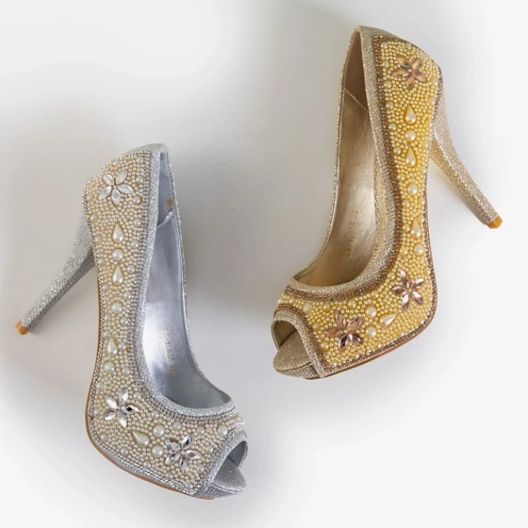 - Pompe senzaționale de femei, stiletto, decorate cu zirconiu cubic și perle. Modelul este realizat din material textil acoperit cu sclipici, cu un branț din piele ecologică. Notă: produsul are o cantitate ușoară de adeziv pe material.