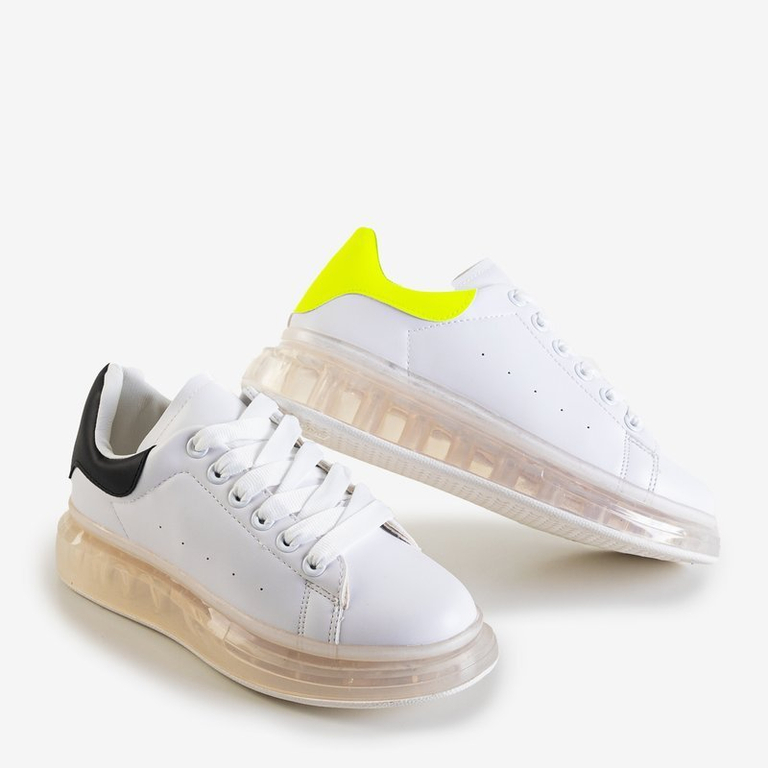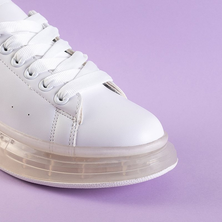- Încălțăminte sport din piele ecologică în alb. Model cu partea superioară dantelată și o inserție colorată pe călcâi. Talpa transparentă din material cauciuc conferă unicitate. Accesoriul perfect pentru o ținută sportivă.